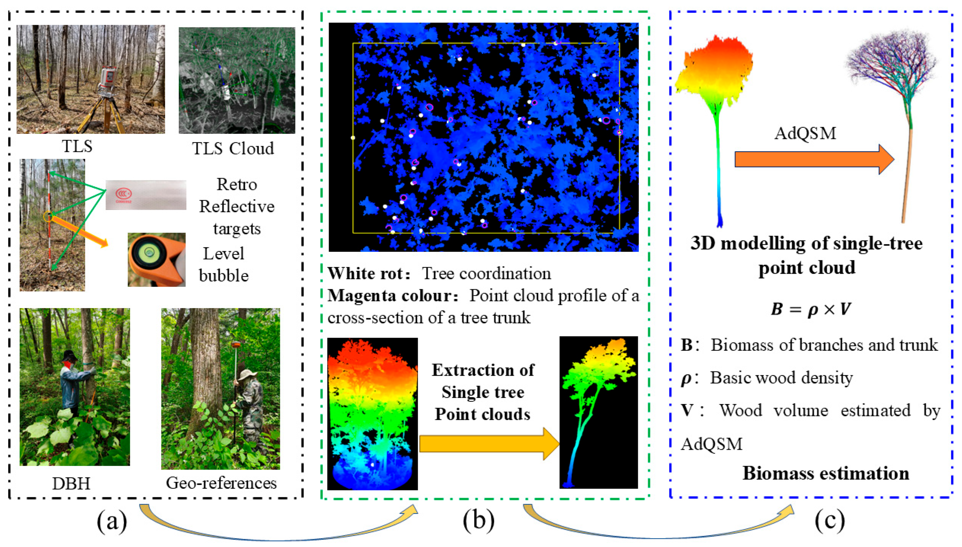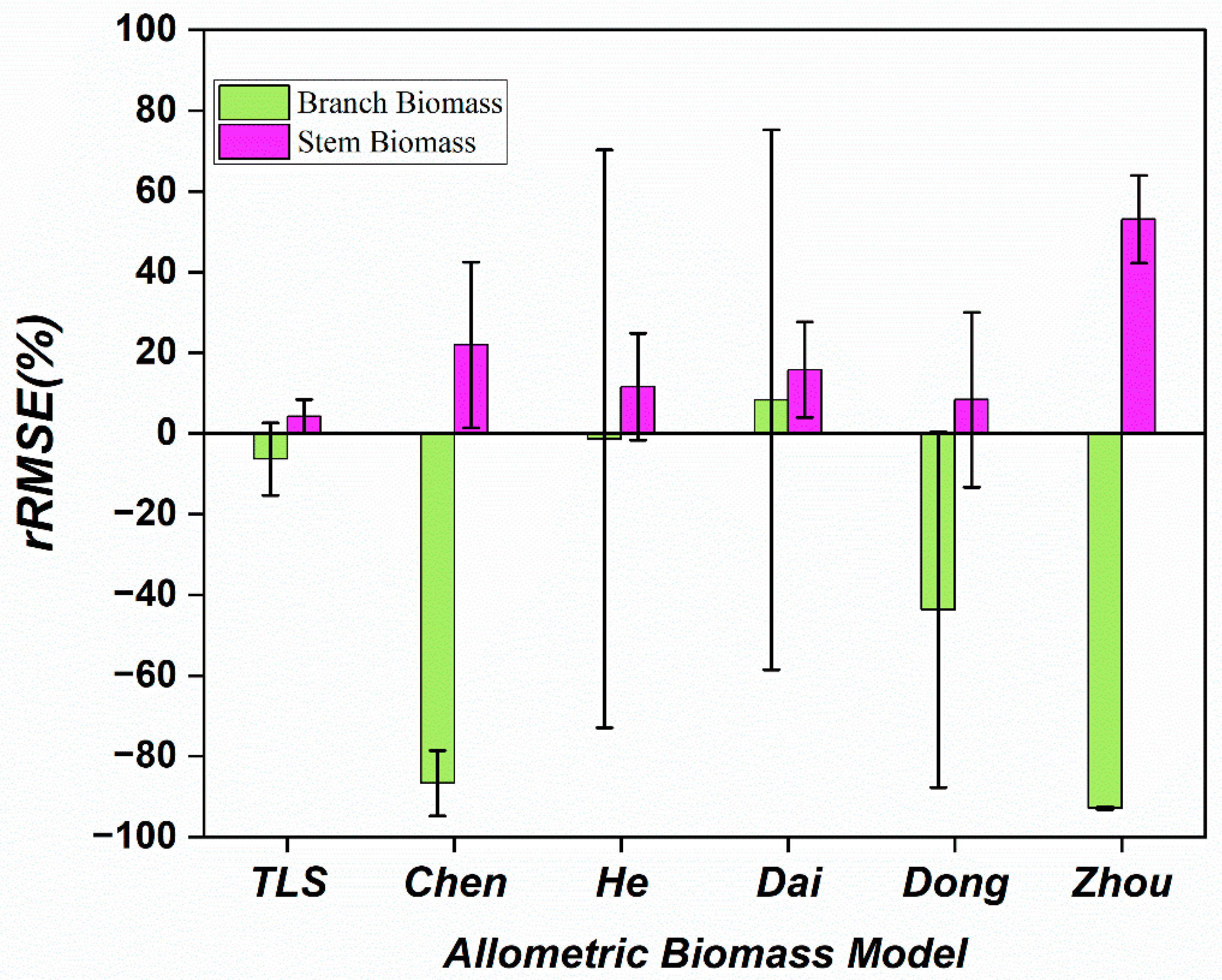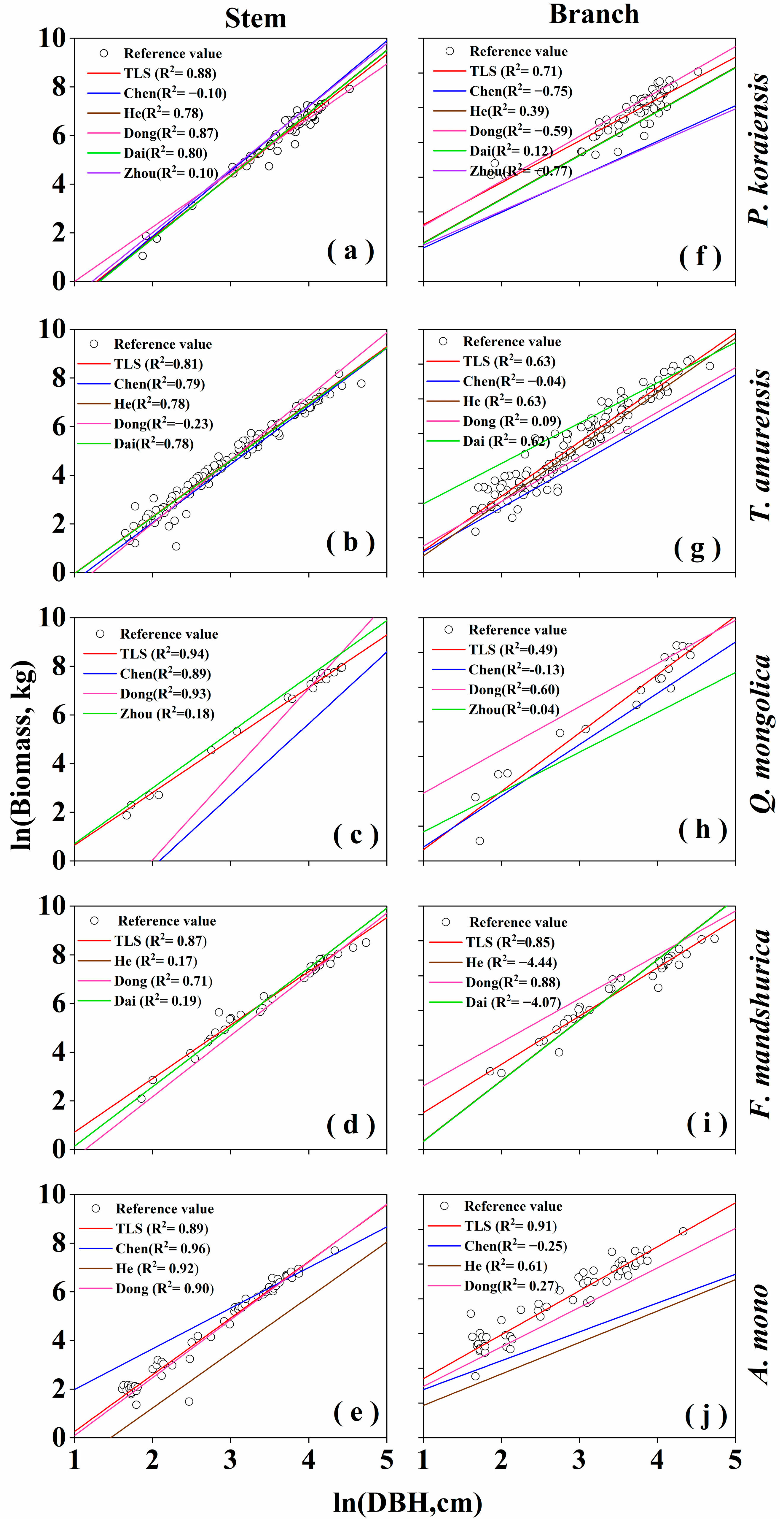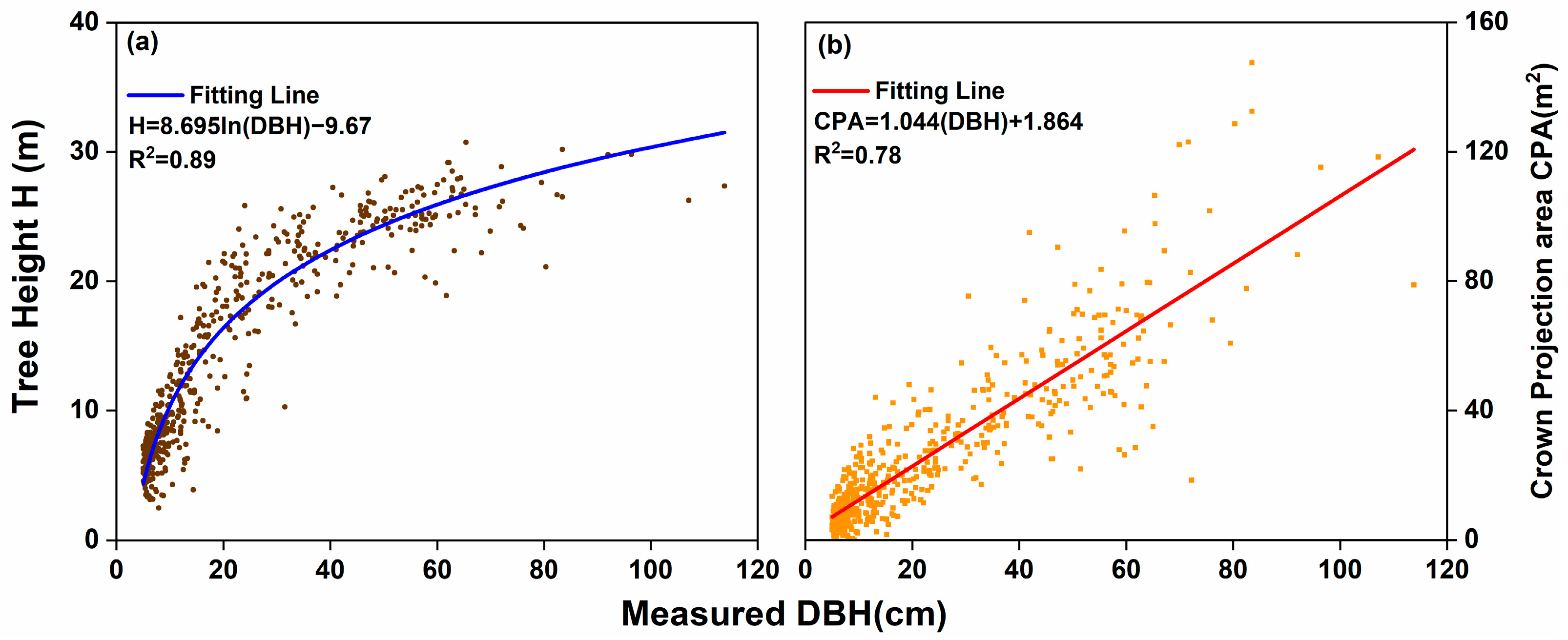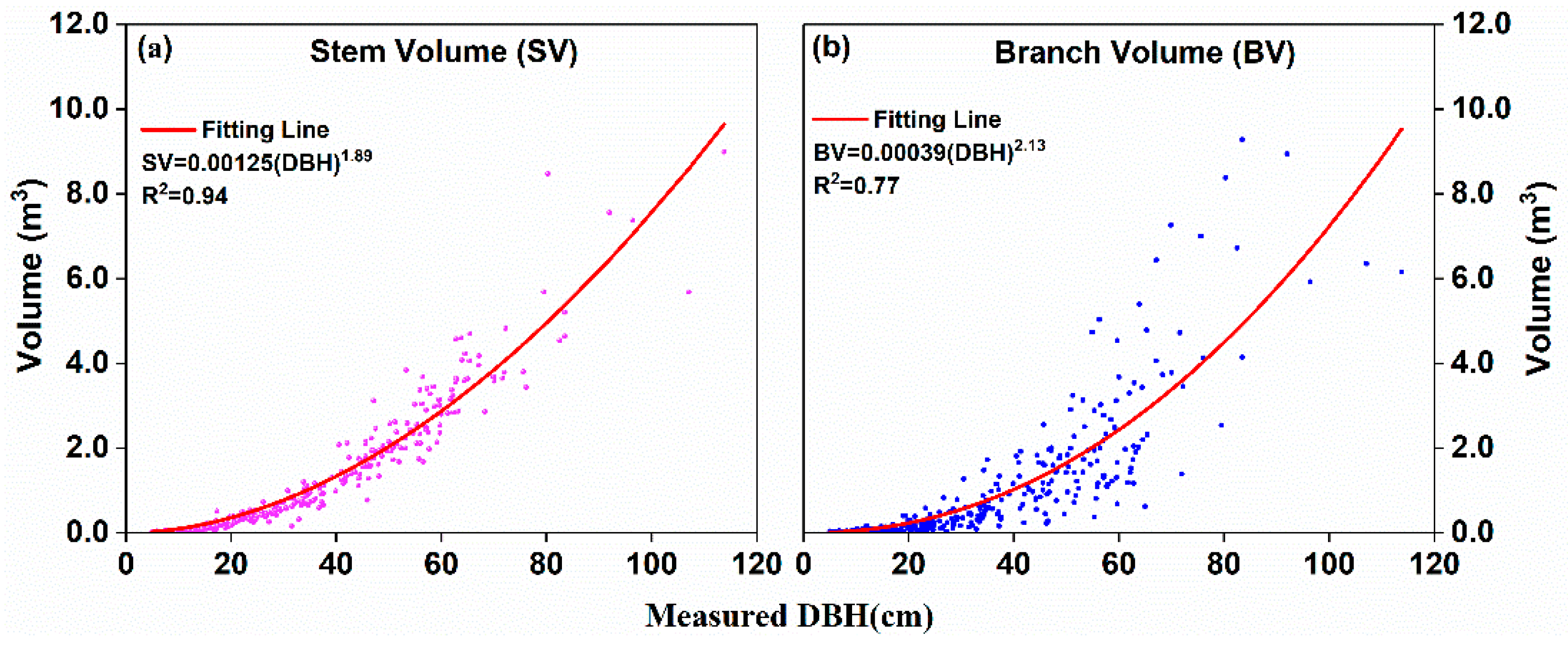 Accurate assessment of stand structure is fundamental for elucidating the relationship between forest structure and ecological function, which is vital for enhancing forest quality and ecosystem services. This study, conducted in a 1 hm2 plot of old-growth broadleaved-Korean pine forest in Changbai Mountain, integrated Terrestrial Laser Scanning (TLS), precise geographic coordinates, Quantitative Structure Models (QSM), and wood density data. This methodology enabled a precise, non-destructive quantification of key structural parameters—DBH, tree height, crown overlap, stand volume, and carbon storage—and the development of species-specific allometric equations. The results demonstrated that TLS-derived DBH estimates were 99% accurate, consistent across diameter classes. The overall crown overlap rate (DBH ≥ 5 cm) was 59.1%, decreasing markedly to 26.7% and 19.2% at DBH thresholds of 20 cm and 30 cm, respectively. Allometric models based on DBH showed higher predictive accuracy for stem biomass than for branches, and for broadleaved species over conifers. Notably, conventional models overestimated stem biomass while underestimating branch biomass by 1.34–92.85%, highlighting biases from limited large-tree samples. The integrated TLS-QSM approach provides a robust alternative for accurate biomass estimation, establishing a critical foundation for large-scale, non-destructive allometric modeling. Its broader applicability, however, necessitates further validation across diverse forest ecosystems.