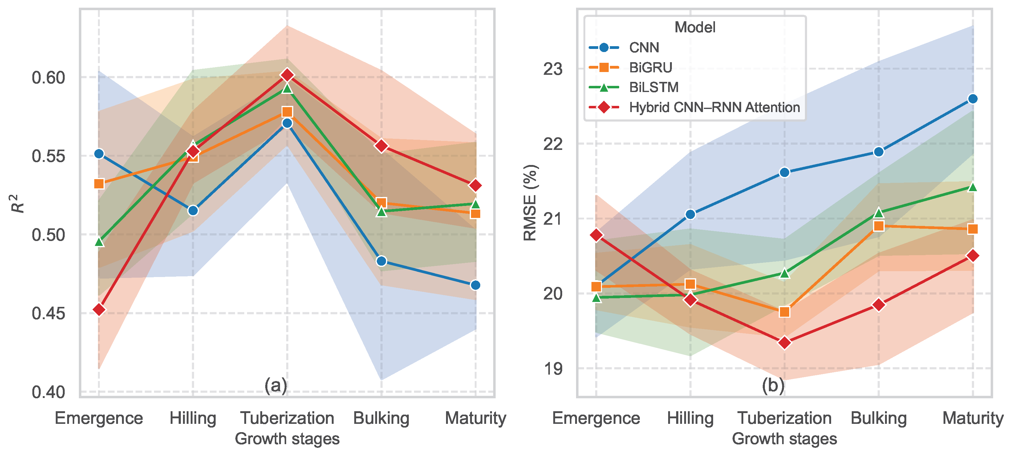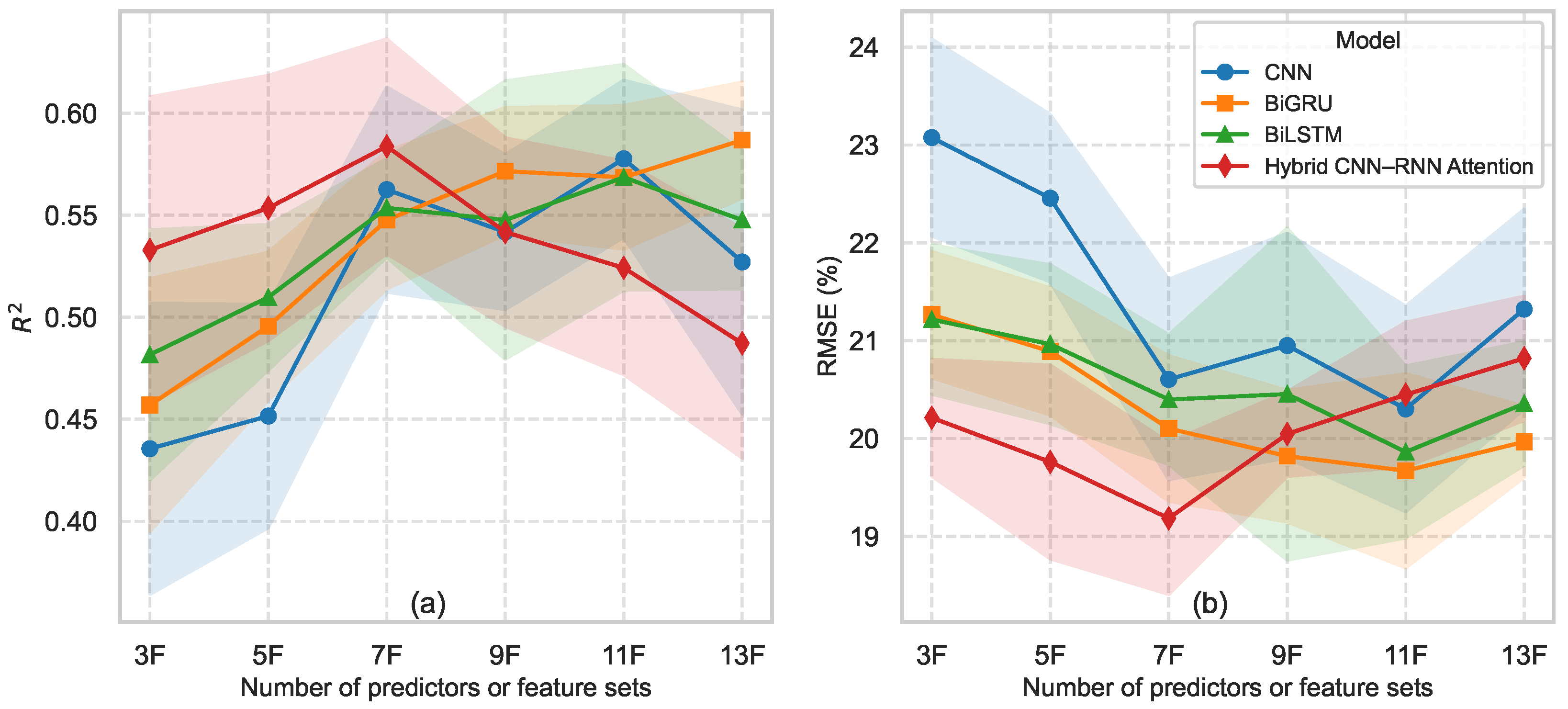 - The hybrid CNN–RNN–Attention model achieved the highest accuracy, reaching and RMSE 18% using only seven robust predictors.