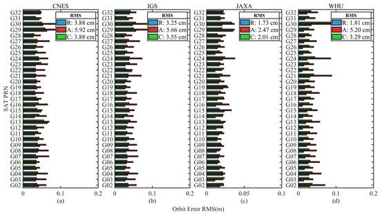 The RMS of GPS, Galileo, and BDS from four analysis centers are shown in Figure 2, Figure 3 and Figure 4, respectively. While Figure 2a–d and Figure 3a–d present the evaluation results for CNES, IGS, JAXA, and WHU, respectively, Figure 4a–c present the evaluation results of CNES, IGS, and WHU, respectively. The average RMS of the satellites for each system are also shown in each subfigure in the R, A, and C directions. Since BDS GEO satellite products are not included in the CNES and WHU analysis center, the BDS satellite orbit errors are evaluated only for MEO satellites.