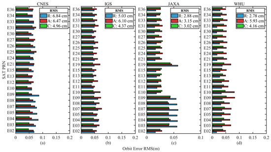 RMS of orbit differences in R, A, and C directions with respect to the final reference products of Galileo satellites. (a) RMS of orbit differences from CNES products; (b) RMS of orbit differences from IGS products; (c) RMS of orbit differences from JAXA products; (d) RMS of orbit differences from WHU products.