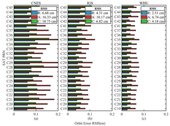RMS of orbit differences in R, A, and C directions with respect to the final reference products of BDS satellite. (a) RMS of orbit differences from CNES products; (b) RMS of orbit differences from IGS products; (c) RMS of orbit differences from WHU products.