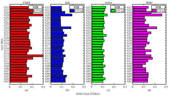 Standard deviation (STD) of each GPS satellite clock corrections with respect to the final reference products. (a) STD of clock differences from CNES products; (b) STD of clock differences from IGS products; (c) STD of clock differences from JAXA products; (d) STD of clock differences from WHU products.