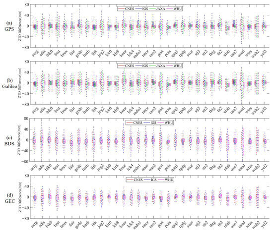 Table 3 gives the average mean, STD, and RMS statistics of ZTD estimates at 32 stations in the four solutions. The mean values of four analysis centers demonstrate a good consistency, which differences in four centers in single-system solutions are under 1 mm and multi-system solution difference is under 0.5 mm. Both the STD and RMS statistics show that GPS + Galileo + BDS3 solutions are best, GPS-only ones are secondary, and Galileo-only and BDS3-only are slightly worse. Take RMS, for example; this phenomenon can be seen clearly in the example of CNES statistical data. The RMS statistics from CNES in four solutions are 7.78 mm, 10.17 mm, 11.02 mm, and 7.72 mm, respectively. Compared with GPS-only, Galileo-only, and BDS3-only solutions, multi-system solution RMS reduces 7.8%, 31.7%, and 42.7%, respectively.