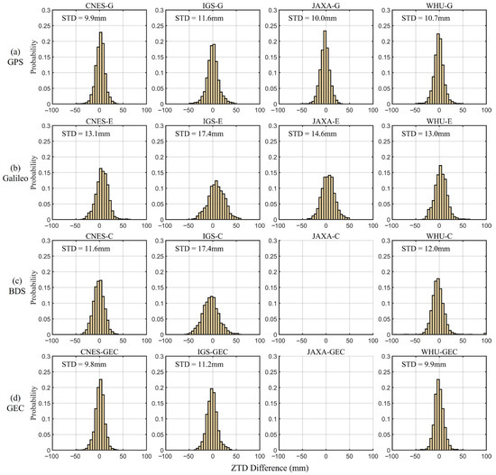 Figure 10 gives the histogram of the ZTD differences between different analysis centers for USN7 station under the four solutions of GPS-only, Galileo-only, BDS3-only, and GPS + Galileo + BDS3. It is shown in each subplot that the histogram of the ZTD difference follows the normal distribution. Additionally, the GPS-only STDs of four analysis centers are relatively close to each other, which STD from CNES products best with 9.9 mm and STD from IGS products worst with 11.6 mm. From Figure 10b–d, STD from CNES products with the best accuracy and STD from IGS products with the worst accuracy are also shown.