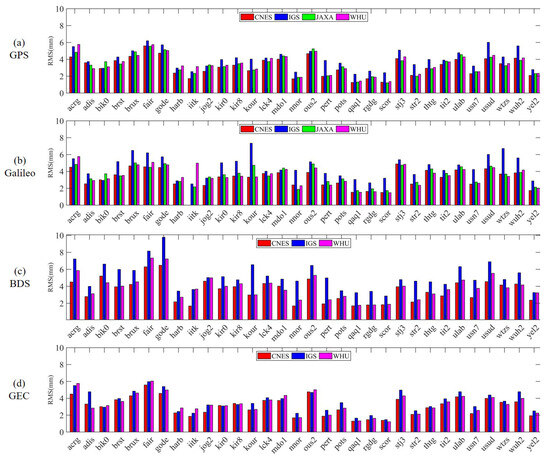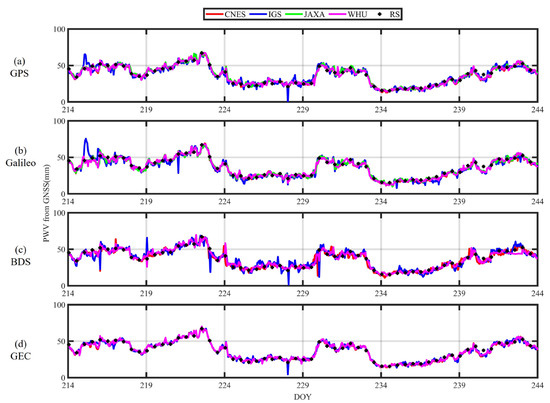 To evaluate the overall performance of PPP-PWV retrieval, Table 4 summarizes the average PWV statistics of the 32 stations. As shown in Table 4, the RMS of the differences between the PWV and ERA5 data obtained from the retrieval of each analysis center is below 5 mm. Take RMS of PWV from CNES products as an example, multi-system solutions are with the best accuracy, and GPS-only accuracy is higher than Galileo-only and BDS3-only. The RMS of PWV from CNES products for four solutions are 3.15 mm, 3.25 mm, 3.50 mm, and 3.09 mm, which are higher than IGS, JAXA, and WHU solutions. RMS of PWV from IGS products for four solutions are unsatisfactory, where PWV accuracy of single-system and multi-system solutions are more than 3.78 mm, 4.10 mm, 4.59 mm, and 3.34 mm, respectively. The PWV retrieval from WHU real-time product outperforms IGS product in all four solutions, yielding RMS values of 3.42 mm, 3.48 mm, 3.87 mm, and 3.31 mm, respectively, which generally meet the accuracy requirement. Notably, PWV retrieval from CNES products has the best accuracy than the other analysis centers.
