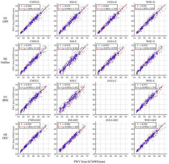 Figure 11 shows a good agreement between PPP-PWV and PWV derived from radiosonde data. However, due to the fact that radiosonde data is solely available twice each day (00:00 and 12:00), there are only 60 RS datasets during 30 days. Thus, a correlation analysis between GNSS PWV and radiosonde PWV time series is solely of limited significance. Figure 12 shows the correlation between PPP-PWV and ECMWF data of the four solutions by the linear fitting. Horizontal and vertical axes are PWV from ECMWF and PPP-PWV, respectively. JAXA results in Figure 12a,d are also absent. Each column shows that multi-system solution correlation coefficient higher than single-system correlation coefficients, and GPS-only solution has the highest correlation in the single-system solution.