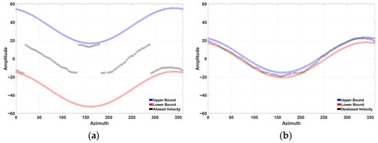 (a) Original and (b) dealiased Doppler velocities. Upper (blue color) and lower (red color) bracketed sine curves are in initial state in (a). By squeezing iterations and data replacements, the correct and dealiased Doppler velocity data is derived (b).