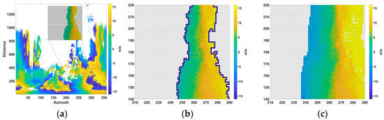 (a) Aliased Doppler velocity data after aliasing, (b) test Doppler velocity data without aliasing, and (c) aliased test Doppler velocity.