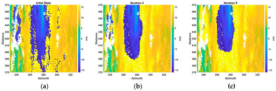 (a) Initial aliased state, (b) state after 2 iterations, and (c) state after 9 iterations of Doppler velocity data.