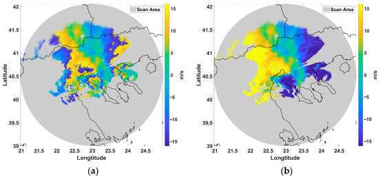 Weather radars, especially those equipped with Doppler technology, are essential tools for meteorology, offering high spatial and temporal resolution that significantly improves weather analysis and forecasting, especially for weather systems that involve atmospheric convection [1]. Thus, Doppler technology plays a key role in monitoring severe weather events, including thunderstorms, heavy storms, and flash floods [2,3,4]. Doppler radar works by emitting electromagnetic waves that reflect off atmospheric particles in various diameters, such as raindrops or snowflakes. Doppler radar primarily measures reflectivity, which provides information on precipitation intensity [5]. The frequency shift in the returned signal allows radial velocity to be measured, which represents the motion of these particles towards or away from the radar [2]. This information is valuable for capturing wind field composition, especially within thunderstorms, and estimating their motion. Therefore, it can be used for nowcasting severe weather phenomena by helping weather forecasters to track convective motions and improve short-term precipitation forecasts [2,6,7]. Furthermore, the radar could enhance numerical weather prediction (NWP) capabilities by contributing to its evaluation and data assimilation systems [8,9,10,11].