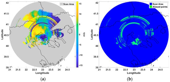 The maximum measurable radial velocity is constrained by the radar’s pulse repetition frequency (PRF) and transmitted wavelength, leading to the Doppler velocity readings being limited. When true velocities exceed this limit, velocity dealiasing poses a significant challenge in assimilating radial Doppler velocity data [19]. This effect, known as the Nyquist velocity limit, causes Doppler velocity measurements to become ambiguous, resulting in incorrect or reversed velocity readings [5]. When aliasing occurs, the measured velocity is folded back within the radar’s detectable range (sine folding), distorting the wind field analysis, particularly in high-wind environments, such as thunderstorms or heavy rainfall [9,19]. Doppler velocity dealiasing remains critical due to the radar’s limited unambiguous velocity range, determined by its PRF [9]. Therefore, aliased velocity data as derived from Doppler radar observations can significantly compromise the accuracy of weather predictions by affecting data assimilation. Dealiasing aims to correct sine folding errors by adjusting the aliased velocities to their initial state, ensuring that the measurements accurately reflect the true motion of the detected particles. The challenge intensifies in cycled data assimilation systems, where dealiasing errors propagate over time, compounding inaccuracies in successive model runs [19]. Velocity aliasing is more frequently met during intense rainfall and orographic enhancement of precipitation. The application of suitable dealiasing techniques is crucial for improving data assimilation and enhancing the accuracy of NWP models [7,18].