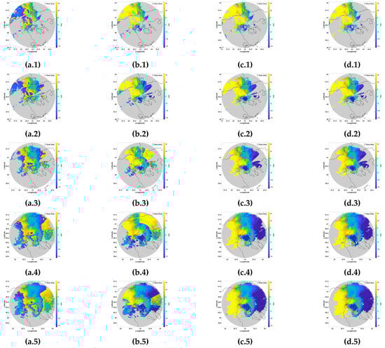 Data from (a) original aliased data, (b) UNRAVEL algorithm, (c) sequential new algorithm, and (d) fully dealiased data. Each row represents the elevation angle number, based on Table 1.