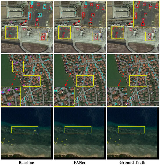 The results show that our proposed model achieves consistent improvements across most metrics. Compared with the baseline, FANet improves and by 0.8% and 0.5% on VisDrone2019, 1.0% and 0.9% on DOTA-v1.5, respectively, demonstrating the effectiveness of frequency-domain feature enhancement and channel attention mechanisms for tiny-object detection in UAV-based remote sensing images. Furthermore, we visualize qualitative detection results on VisDrone2019, as shown in Figure 10. For UAV perspectives, due to the lower flight altitude, the images contain more occlusions and complex backgrounds, as well as a wide variety of object categories and significant scale variations. With frequency-domain feature enhancement, our FANet effectively improves the representation capability for tiny objects, achieving robust detection performance even in these challenging scenarios.
