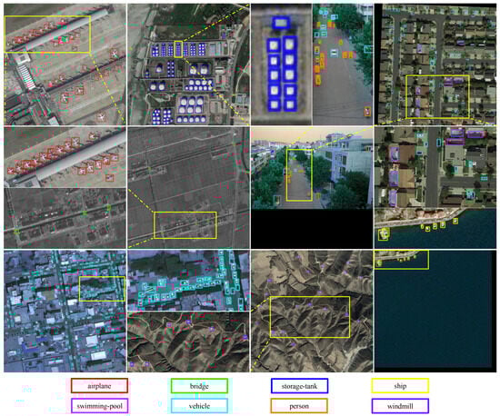 DOTA-v1.5 [3]: DOTA is a large-scale dataset for object detection in aerial images, with images collected from diverse sensors and platforms. It contains 16 common categories, 2806 images, and 403,318 instances. The training, validation, and testing sets are divided into proportions of 1/2, 1/6, and 1/3, respectively. Each image ranges in size from to 20,000 × 20,000 pixels and contains objects exhibiting a wide variety of scales, orientations, and shapes. Compared with DOTA-v1.0, extremely small instances (less than 10 pixels) are also annotated in DOTA-v1.5, making it more suitable for evaluating tiny-object detection performance. In this work, we utilize the horizontal bounding box annotations of the DOTA dataset for training and evaluation.