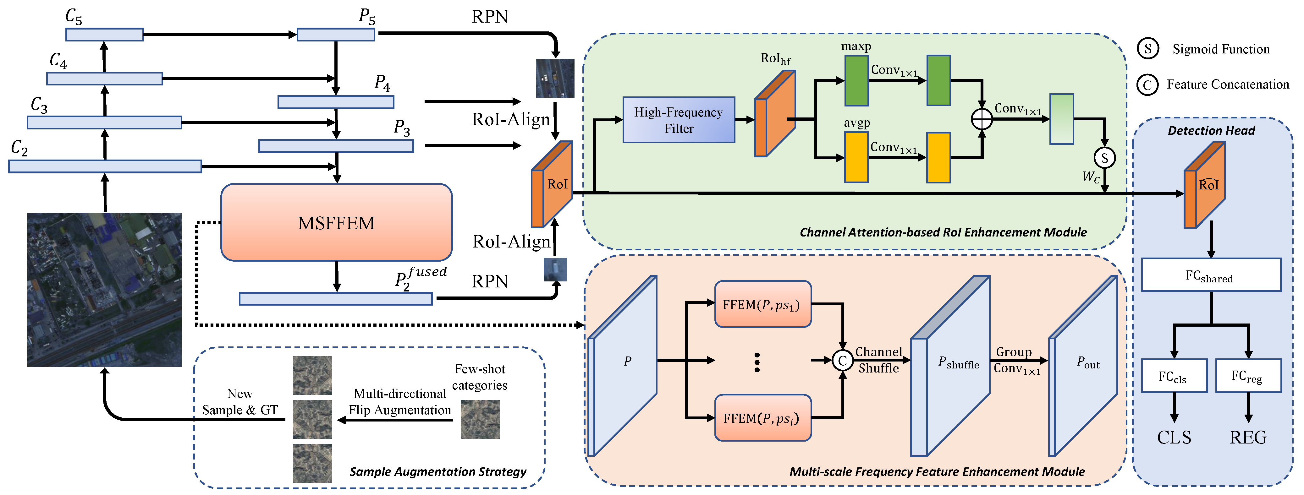 Overview of the proposed FANet. The network is built upon the R-CNN framework, with FPN incorporating the MSFFEM for frequency-domain feature enhancement at the feature map level, and the CAREM for channel attention-based RoI feature refinement at the RoI level. A sample augmentation strategy is employed to balance the training data, improving detection performance for few-shot categories.