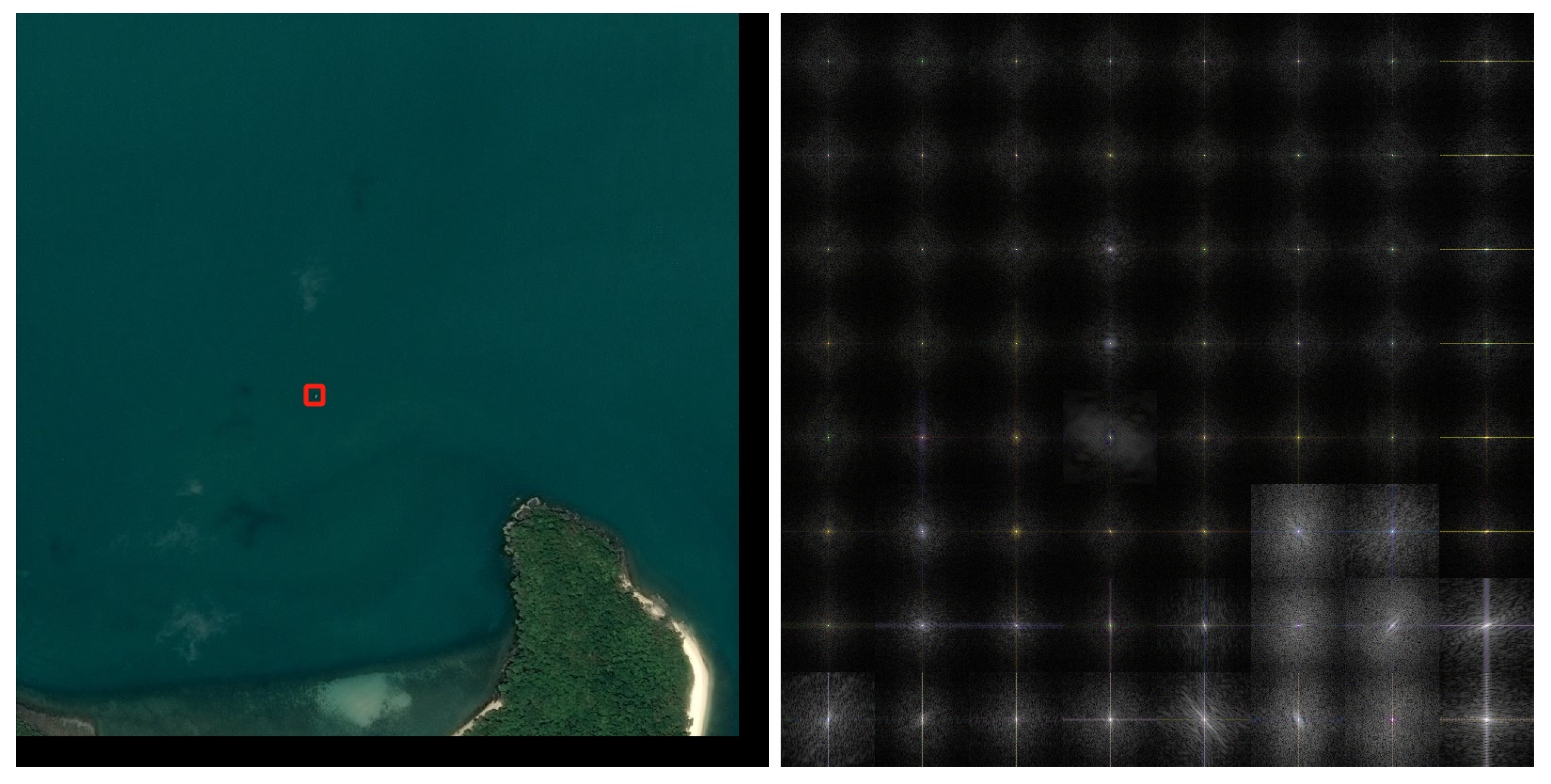 (Left): Remote sensing image containing tiny object in the red box. (Right): Patchwise FFT spectrum visualization. The patch-based FFT reveals that tiny objects exhibit distinctive responses in specific frequency bands, highlighting their spectral characteristics and aiding in discriminative feature extraction.