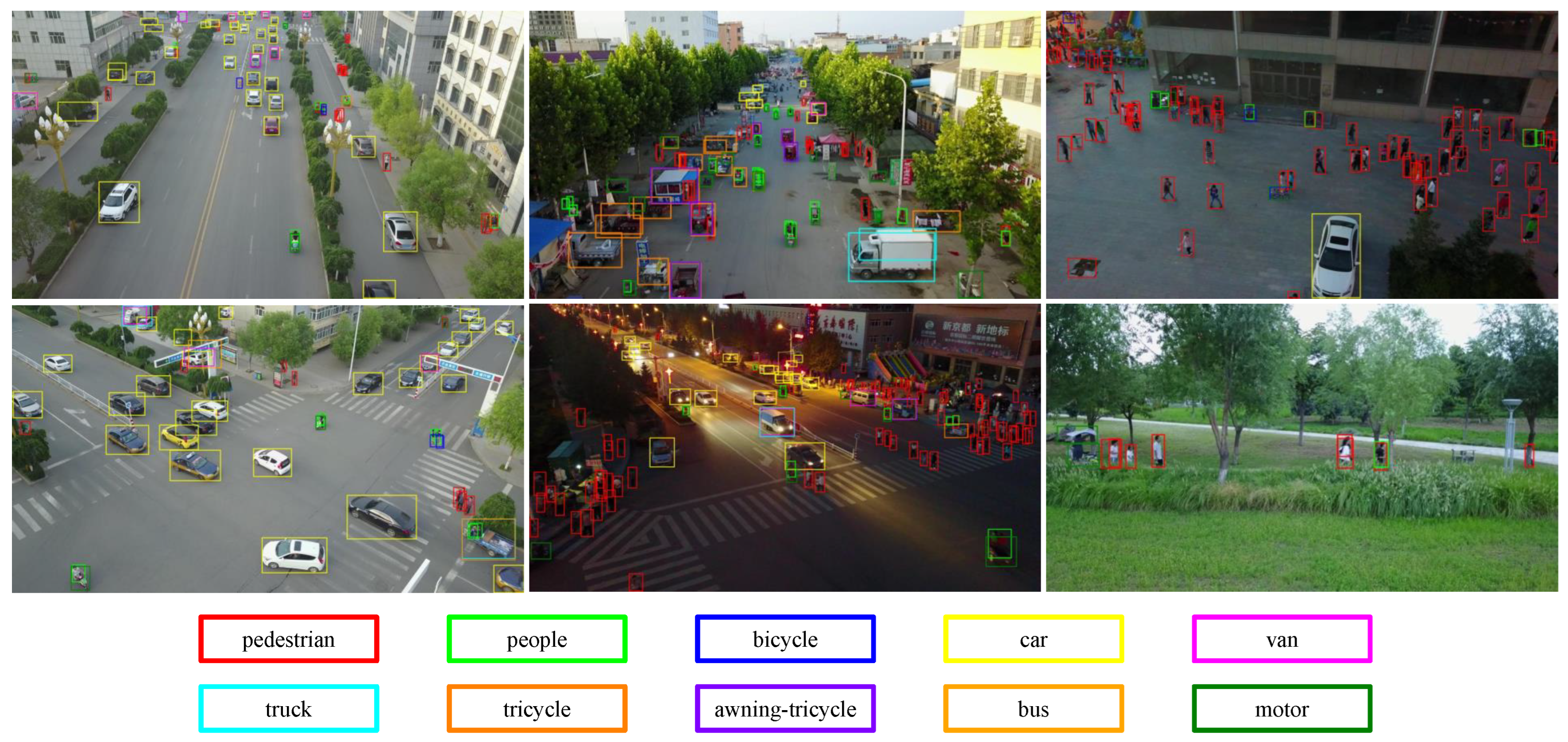 Qualitative detection results achieved by our FANet on VisDrone2019 val set. One color stands for one object class.