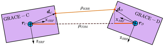 In addition to this geometric correction, the distance between both satellites’ CMs at the same epoch differs from the measured KBR biased range due to the travel time of the microwave between the twin spacecrafts. This is corrected by the light-time correction (LTC), denoted as . Taking into account other error sources, including integer ambiguity , multipath noise and stochastic noise , the GRFO range observations are described by the following ionosphere-free combination [18]