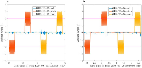 By solving Equations (53) and (58), we obtain the multipath noise at the maneuver frequency and the AOVs . Likewise, the AOV of GRACE-D can be solved using a similar method based on measurements from 28 September 2020.