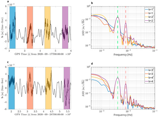 The vector on 17 September 2020 (a, blue for negative pitch sub-maneuver, orange for positive pitch, yellow for negative yaw, purple for positive yaw) and 28 September 2020 (c). The amplitude spectral density of the data superimposed on a strip with the same colors is shown in (b,d). In the second column, the green dashed lines indicate the maneuver frequency , and the red lines indicate the doubling maneuver frequency .