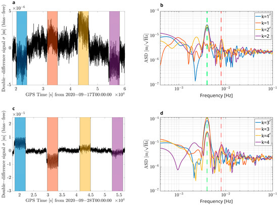 The double-difference signal on 17 September 2020 (a, blue for negative pitch sub-maneuver, orange for positive pitch, yellow for negative yaw, purple for positive yaw) and 28 September 2020 (c). The amplitude spectral density of the data superimposed on a strip with the same color is shown in (b,d). The green dashed lines indicate the maneuver frequency and the red lines indicate the doubling maneuver frequency .