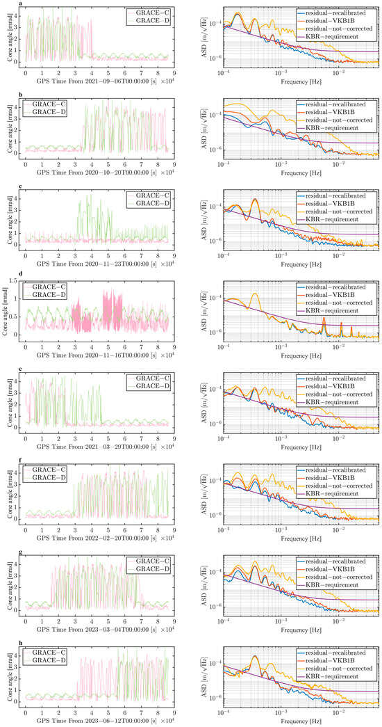 Cone angles of twin GRFO satellites (left panel, pink for GRACE-C and green for GRACE-D) and the ASDs (right panel) of the LRI range residuals with the uncorrected KBR range (yellow), that corrected by VKB1B (blue) and that corrected by our results (blue) on 6 September 2020 (a), 20 October 2021 (b), 23 November 2020 (c), 16 November 2020 (d), 29 March 2021 (e), 20 February 2022 (f), 4 March 2023 (g) and 12 June 2023 (h).
