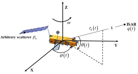 Taking a space target as an example, the ISAR observation model can be equated to the turntable model as shown in Figure 1 after the translational motion compensation. An ISAR image is the projection of the 3D geometry of the space target on the imaging plane. The range resolution of an ISAR image is dependent on the signal bandwidth of the transmitted electromagnetic wave. The larger the signal bandwidth is, the higher the range resolution is. The cross-range resolution of an ISAR image depends on the relative rotational angle of the target to the radar line of sight (LOS). The larger the relative rotational angle is, the smaller the wavelength of the transmitted electromagnetic wage is, and the higher the cross-range resolution. A simpler target observation model has been constructed in Refs. [11,13], where the motion of the observed target relative to the radar LOS during a single coherent processing interval (CPI) is approximated as if the radar LOS remains fixed while the observed target rotates around a specific axis. In Figure 1, the azimuth and pitch angles of the radar LOS vector are denoted by and , respectively. The instantaneous radial distance and Doppler frequency of an arbitrary scatterer can be represented by and , respectively. Consequently, the projection positions of each scatterer adhere to certain relationships, which are as follows: