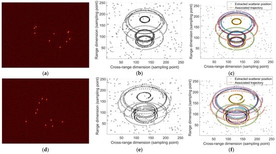 Based on the configured observation scenario, we have acquired a total of 12,000 echoes for each scenario. These echoes are segmented into 92 sub-apertures, with each sub-aperture having a window length of 256 and a step size of 128. Subsequently, the RD imaging algorithm is applied to each scenario, yielding 92 frames of ISAR images. To these imaging results, Gaussian white noise with a signal-to-noise ratio (SNR) of 10 dB is added. Some of the ISAR images are shown in Figure 5a,d. Following this, the 2D-ESPRIT algorithm [11] is utilized to extract the scattering centers from the sequential ISAR images under the two observation scenarios, as shown in Figure 5b,e. It is evident from Figure 5b,e that there are numerous false alarm points and leakage detections. Based on the scattering center extraction results, the detection probability of each scatterer is set to 0.95, and the clutter density is set to 3 × 10−5 per square pixel. The image size is 256 × 256 pixels.