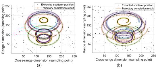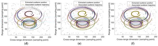 The proposed ML-GM-PHD filtering algorithm is applied to obtain the trajectory association results in the two observation scenarios, as illustrated in Figure 5c,f. The trajectories of different scatterers are represented by curves of distinct colors. It is evident that the proposed method achieves excellent trajectory association performance in both the scenarios. Since the filtering process incorporates a high-maneuvering motion model, the constraint of elliptical motion is no longer a mandatory requirement. Additionally, the proposed method is capable of filtering out clutter and estimating missing detections, thereby demonstrating robustness in complex environments.