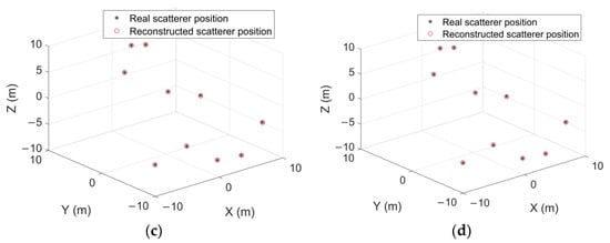 where , , and denote the scatterer number, the true 3D coordinates of nth scattering center, and the reconstructed 3D coordinates of nth scattering center, respectively. The RMSE metric quantifies the absolute discrepancy between the reconstructed 3D coordinates and the true 3D coordinates of the scattering centers. The poorer the 3D reconstruction performance, the higher the RMSE will be. Conversely, a smaller RMSE indicates better reconstruction performance.