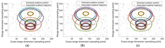 When the detection probability of the scattering center is set to 1, the trajectory association results of different algorithms are shown in Figure 7. It is evident that the MCMCDA algorithm can achieve satisfactory trajectory association performance, as depicted in Figure 7a, when the scatterer trajectory coincides with an ellipse. However, when the ellipse constraint for the scattering center trajectory is not met, the performance of MCMCDA algorithm declines significantly, as shown in Figure 7d. A substantial number of extracted points fail to be correctly correlated, and there exist cases where multiple points from the same scattering center are incorrectly associated to different trajectories.
