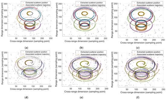 Trajectory association results of different algorithms when the scatterer detection probability is set to 1. (a) Trajectory association result of scatterers with elliptical motion model by applying MCMCDA algorithm. (b) Trajectory association result of scatterers with elliptical motion model by applying standard L-GM-PHD algorithm. (c) Trajectory association result of scatterers with elliptical motion model by applying proposed algorithm. (d) Trajectory association result of scatterers with non-elliptical motion model by applying MCMCDA algorithm. (e) Trajectory association result of scatterers with non-elliptical motion model by applying standard L-GM-PHD algorithm. (f) Trajectory association result of scatterers with non-elliptical motion model by applying proposed algorithm.