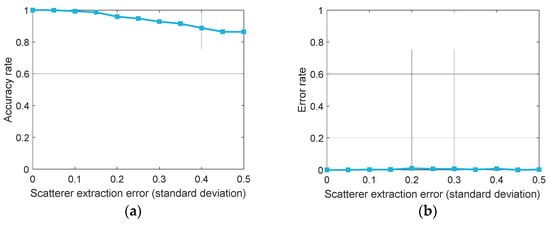 To evaluate the performance of the trajectory association algorithm under varying degrees of scattering center extraction error, random bias is introduced into the ideal extraction positions of the scatterers. For the sake of generality, this bias is selected to follow a Gaussian distribution, with the standard deviation ranging from 0 to 0.5 sampling points in increments of 0.05 sampling points. Under each level of bias, 50 Monte Carlo simulation experiments are performed. The trajectory association evaluation metrics are computed and statistically analyzed, as depicted in Figure 9a,b. The experimental results demonstrate the robustness of the proposed method against the scattering center extraction errors. The accuracy rate of trajectory association exceeds 90%, and the error rate remains below 1% when the standard deviation of the position bias is less than 0.3 sampling points.