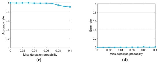 Concurrently, to analyze the performance sensitivity of the proposed algorithm to the different scattering center detection probabilities, the detection probability is varied linearly from 0.9 to 1, with a step size of 0.01. For each detection probability setting, 50 Monte Carlo experiments are conducted. The accuracy and error rates of the trajectory association results are calculated and analyzed, as presented in Figure 9c,d. The experimental results reveal that the proposed algorithm demonstrates robustness across a range of scatterer detection probabilities. High accuracy rates and low error rates in trajectory association are attainable when the scatterer detection probability exceeds 0.9.