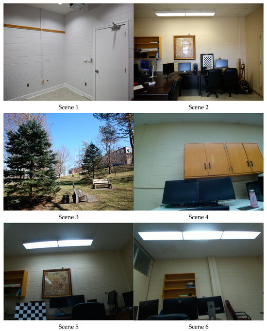 The experimental scenes employed in this study. The six scenes were acquired in outdoor and indoor environments, representing different object arrangements, lighting conditions, and spatial compositions.