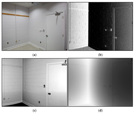 Comparison of different images: (a) optical; (b) bearing angle; (c) intensity; and (d) depth.