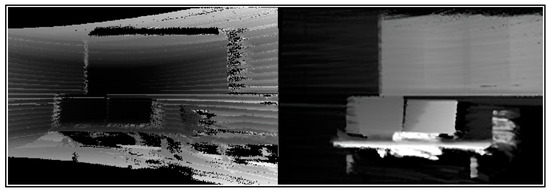 Before (left) and after (right) attempts to remedy the range dispersions in the SLAMM-BOT depth image.