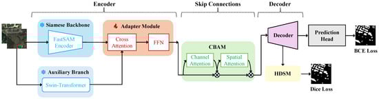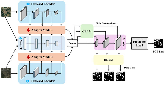 As shown in Figure 3, the bi-temporal images and are first projected by a weight-sharing Siamese FastSAM encoder, where and denote the height and width of the input images, respectively. FastSAM is built on CNNs and is capable of outputting feature maps at four spatial scales: , , , and . The output features of FastSAM can be represented as , with the scale indices defined as , respectively. The Swin-Transformer in the auxiliary branch also extracts multi-scale features, , corresponding to the features of the FastSAM encoder. Next, we construct trainable lightweight adapter modules by leveraging the cross-attention mechanism, which consolidates the general knowledge of two PVFMs (FastSAM and Swin-Transformer) to obtain local and global dependencies while exploiting their combined strengths in multi-scale information extraction. The multi-scale features from the two pre-trained vision models will be fed into a trainable corresponding to each scale. We can obtain outputs like from the adapter modules. Finally, we concatenate the corresponding scale of bi-temporal image features from adapter modules and obtain the final outputs of the encoding stage. Subsequently, CBAM is inserted into the skip connection paths of the U-Net architecture, and the HDSM is introduced to apply deep supervision to the multiple outputs from the decoder. Finally, we obtain the change prediction map after the processing of the prediction head.