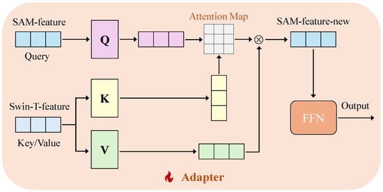 The adapter module is primarily composed of a cross-attention block and a feed-forward network (FFN), as shown in Figure 4. The cross-attention block integrates local multi-scale information from FastSAM with global multi-scale information from Swin-Transformer. The multi-scale feature outputs from FastSAM serve as queries, while the outputs from the Swin-Transformer branch act as keys and values in the computation of the cross-attention mechanism.