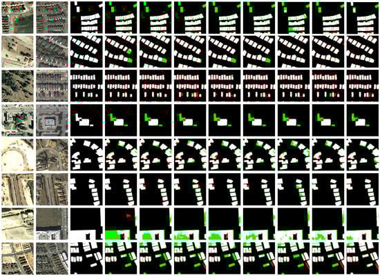 Visualization results of different methods on WHU-CD dataset, where TP (white), TN (black), FP (red), and FN (green) are distinguished by different colors.