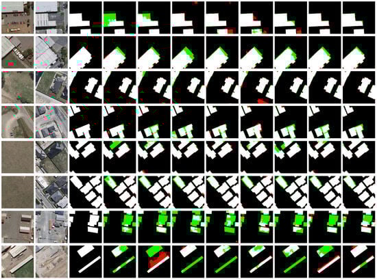 The proposed ASS-CD was implemented using the PyTorch 2.3 framework. It was trained on a single NVIDIA GeForce RTX 3090 GPU with 24 GB of video memory from Santa Clara, CA, USA. We trained the model for 100 epochs across the three datasets. The chosen optimizer was Adam to achieve model convergence. The initial learning rate was set to 1 × 10−3 and was linearly decreased to zero over the course of training. The batch size was set to 8 and the weight decay was configured as 5 × 10−4. The proposed ASS-CD was constructed using the U-Net architecture. Both the FastSAM encoder and Swin-Transformer branch generated feature maps at four different scales, which were connected to the decoder through skip connections.