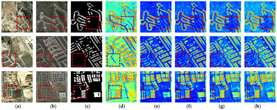 (3) HDSM and Loss Function: HDSM aims to apply deep supervision to intermediate layers at various scales within the network decoder. In addition, integrating Dice loss into the overall loss function helps address the issue of class imbalance between positive and negative samples in CD datasets. Table 5 shows that Model_c has improved in all evaluation metrics compared to Model_a. From the red-boxed regions in Figure 8g, it can be observed that the outlines of background buildings become more blurred compared with Figure 8e. With the introduction of HDSM, the model reduces unnecessary attention to background areas, which belong to negative samples in CD datasets.