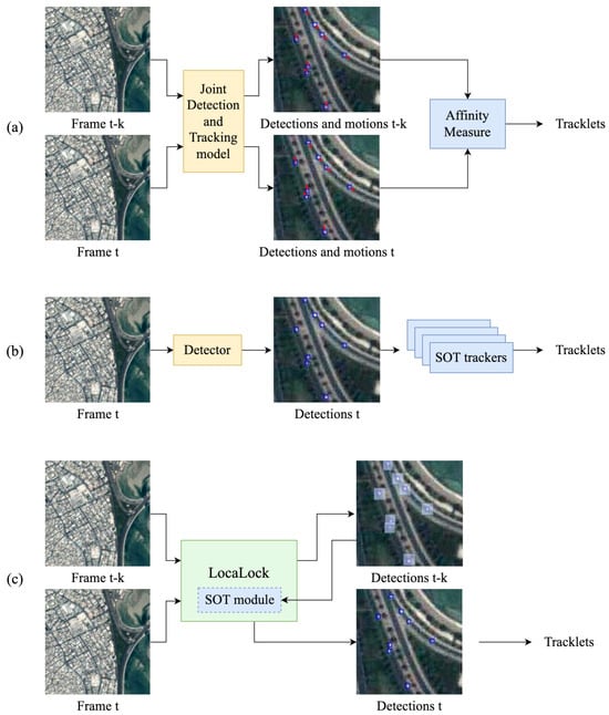 Comparison between the frameworks of (a) joint detection and tracking MOT, (b) SOT for MOT, and (c) our LocaLock method. The notation t represents the current frame time, while refers to the reference frame time, where k is the time difference between the current frame and the reference frame.