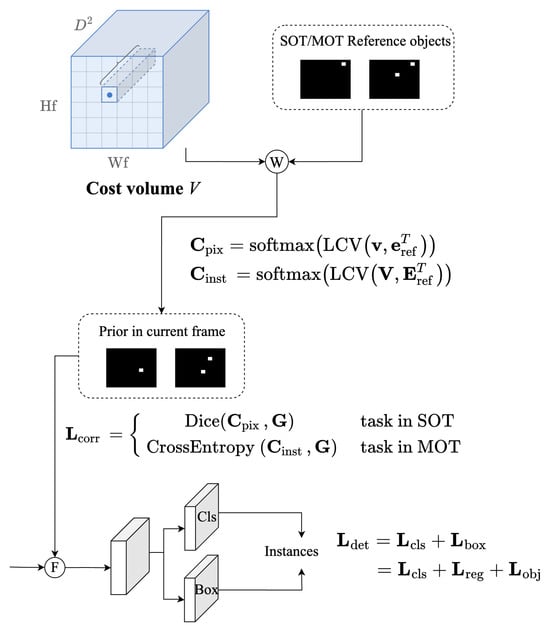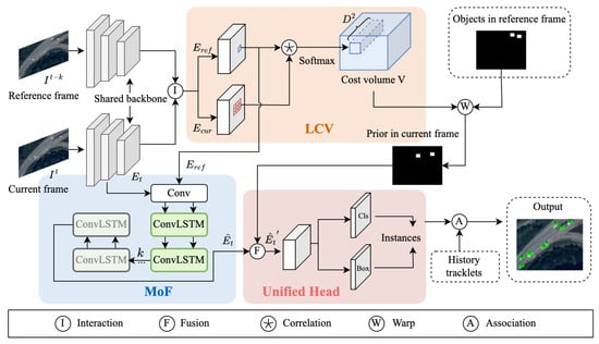As shown in Figure 3, LocaLock has two inputs, the current frame image at time t and the reference frame image at time . are independently fed into the same backbone network to extract their respective features, denoted as and . Then, these two features are processed through a deformable attention module [38] to facilitate interaction between the information from the two frames. Post-interaction, the features of the two frames are denoted as and . are employed in two main processes, where . On the one hand, in the local cost volume module (LCV), and are used to calculate the similarity of local visual embeddings between the two frames, resulting in the generation of a cost volume denoted as . The cost volume is then warped with the predictions in the reference frame to obtain the prior mask in the current frame. On the other hand, is used in the motion flow module to obtain an enhanced current feature, denoted as , which is used for the unified head. The unified head aims to fuse the current frame’s features and the prior mask, unifying information from both aspects to ultimately output the detection results. The association and matching between the result boxes were performed using the same method as SORT.