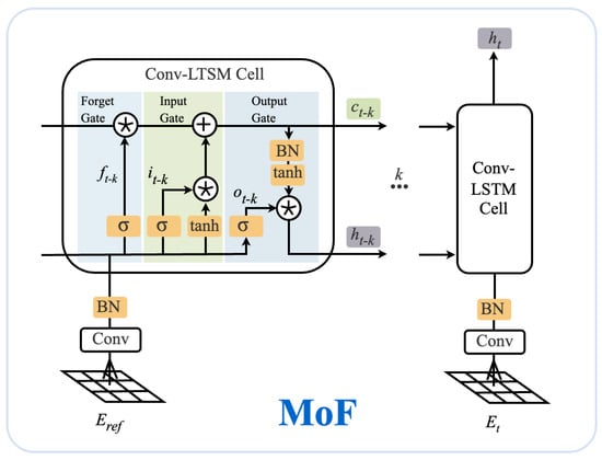 Within the MoF module, all Conv-LSTM units share the same parameters. The Conv-LSTM, a convolutional variant of the traditional LSTM structure, consists of forget gates, input gates, and output gates. The computation within the Conv-LSTM can be formally described as follows: