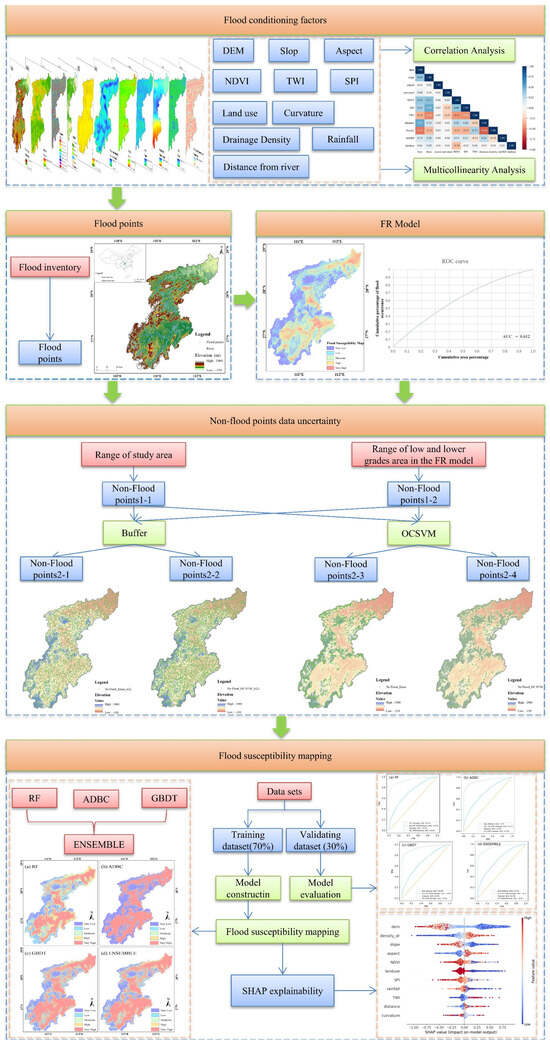 This study process is divided into five parts. The first step is data collection, including flood point location data and flood influencing factor data. The second step is redundancy analysis of influencing factors, including Pearson correlation coefficients and multicollinearity statistical indicators. The third step focuses on constructing non-flood point datasets by identifying medium and low flood susceptibility areas from the primary flood susceptibility results derived from statistical models, integrating the Buffer method and OC SVM method to generate four non-flood point datasets. The third step focuses on constructing non-flood point datasets by identifying medium and low flood susceptibility areas from the primary flood susceptibility results derived from statistical models, integrating the Buffer method and OC SVM method to generate four non-flood point datasets. The fourth step focuses on the uncertainty analysis of the flood susceptibility model. A flood susceptibility model is constructed using machine learning algorithms, and the accuracy of the model based on the four non-flood point datasets is utilized to quantify the uncertainty of the flood susceptibility model simulation. The fifth step is the interpretability analysis of the influencing factors, where the SHAP algorithm is introduced to enhance model interpretability, analyzing the relationship between model prediction results and flood influencing factors. This is shown in Figure 3.