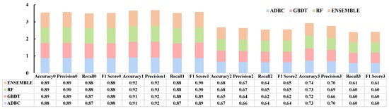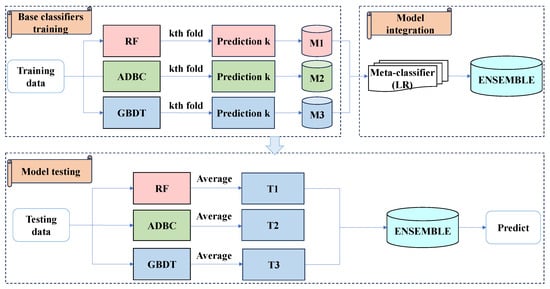 Ensemble models create more powerful learners by combining multiple base learners to produce more accurate model predictions [54,55]. Bagging and boosting ensemble methods combine the same types of models (e.g., decision trees) to reduce instability or bias in a single model, while stacking and blending two algorithms typically integrate different types of models, exploiting the strengths of different models and minimizing their weaknesses to achieve better performance [18]. The ensemble learning method used in this paper is the stacked ensemble learning method [56], which synthesizes several algorithms (regression or classification) during the training phase. In this study, the first step is to train the basic classifier models RF, ADBC, and GBDT; the second step is to synthesize the output features of the three basic classifiers to generate a new set of training data; finally, the ensemble classifier model is trained using a logistic regression algorithm to superimpose the computational errors of ensemble and estimation on all the basic classifiers, and then these residuals are reduced again through a meta-learning step (Figure 4).