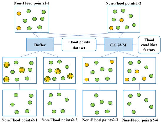 The selection structure diagram of non-flood sample points (The yellow circle represent flood points screened by buffer method, the circle with number represent flood points screened by OC SVM method, and the green represent non-flood points.).