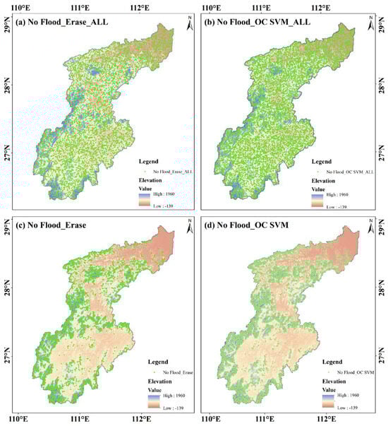 This study utilized a sample set of 3364 flood points based on the flood inventory map to obtain four non-flood point datasets through spatial range and sampling methods. Non-flood point dataset I (ALL Dataset): Non-flood points were randomly selected using the buffer method within the remaining study area after excluding flood points (Figure 7a). Non-flood point dataset II (Dataset): Non-flood points were randomly selected using the buffer method within the lower and low flood susceptibility level ranges identified by the frequency ratio statistical model (Figure 7c). Non-flood point dataset III (ALL OC SVM Dataset): Non-flood points were randomly selected using the OC SVM method within the remaining study area after excluding flood points (Figure 7b). Non-flood point dataset IV (OC SVM Dataset): Non-flood points were randomly selected using the OC SVM method within the lower and low flood susceptibility level ranges identified by the frequency ratio statistical model (Figure 7d). In addition, the buffer distance used in the buffer method in this study was 500 m.