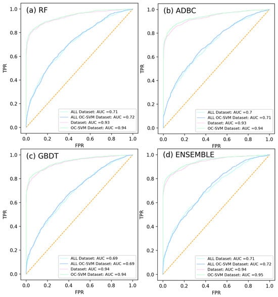 A comparison of the ROC curves and AUC values of different FSM models using four datasets: (a) Random Forest (RF); (b) Adaptive Boosting (ADBC); (c) Gradient Boosting (GBDT); (d) stacking (ENSEMBLE).